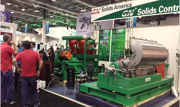本次我公司參展的是一臺處理量達240立方米/小時(1056GPM )的泥漿清潔器和一臺GNLW553 - VFD是鉆井液離心機。GNLW553 – VFD離心機是一臺大體積大處理量的離心機,具有專門的變頻器和PLC控制系統進行快速處理操作。