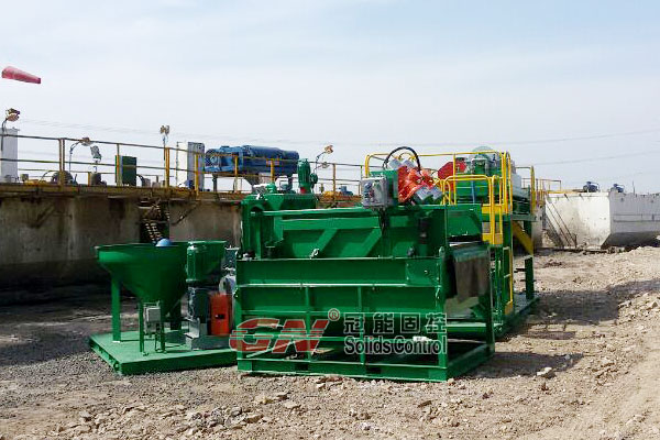 本套系統分為2個階段的固控處理和一套泥漿配置混合系統。鉆井泥漿初步分離采用的是冠能GNZS752型振動篩,200GPM的處理能力、兩片篩網的構造用來處理鉆井泥漿中的大顆粒的固體。振動篩處理后的液體通過離心泵輸送給迷你型的沉降離心機GNLW223進一步處理,可達3800RPM的轉速,分離的固體顆粒可達到2個微米。